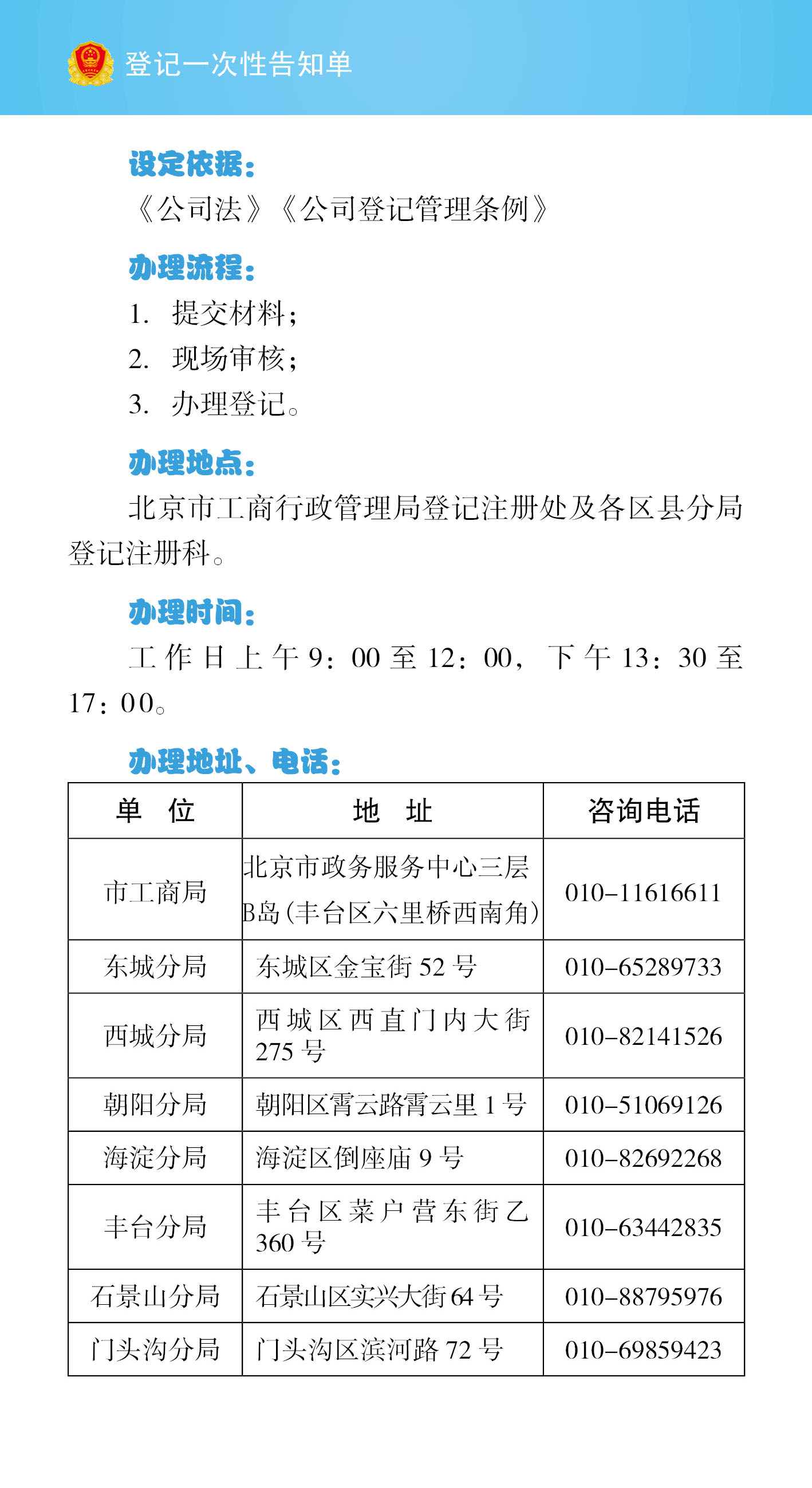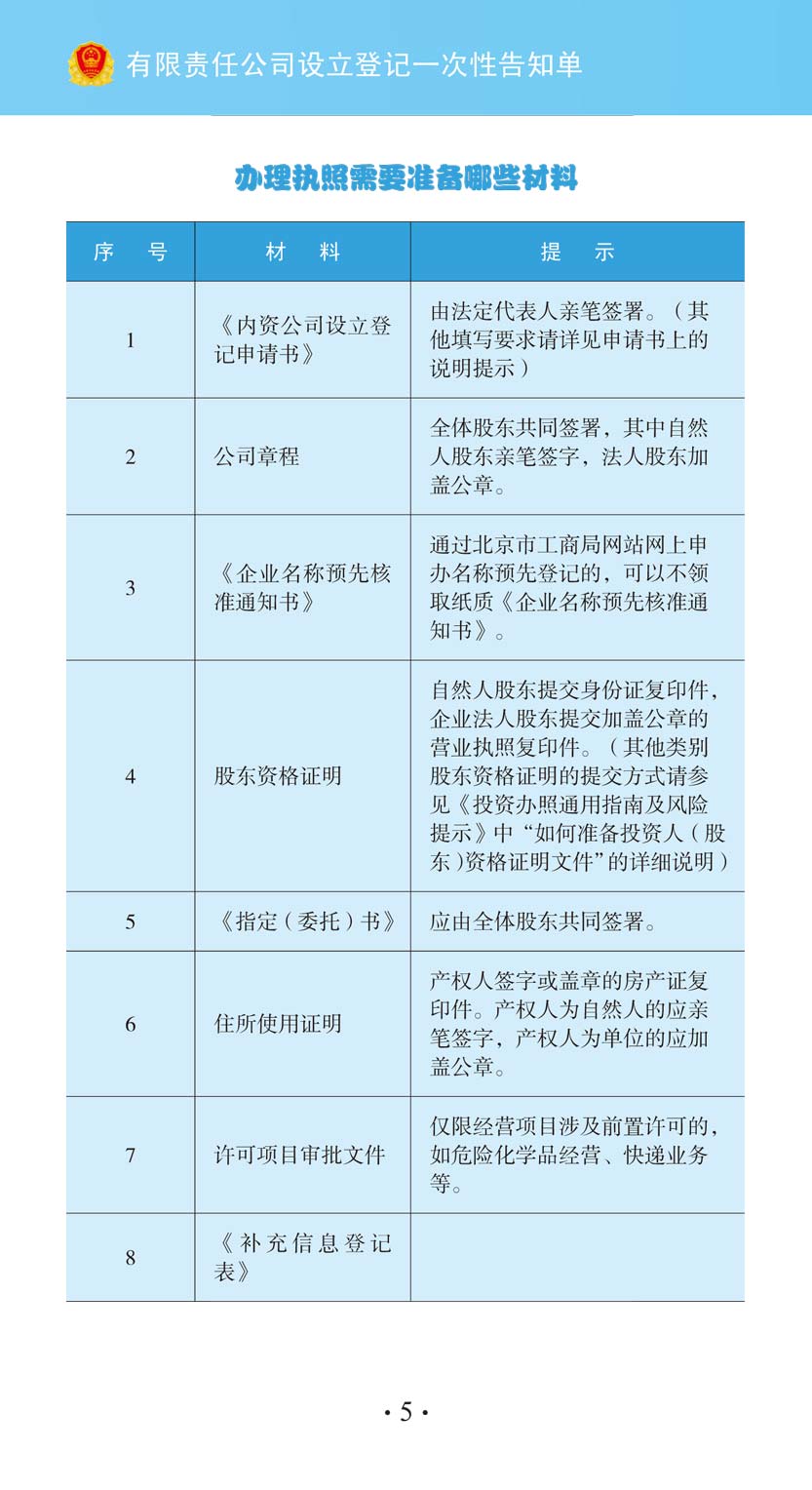 有限責任公司設(shè)立登記一次性告知單